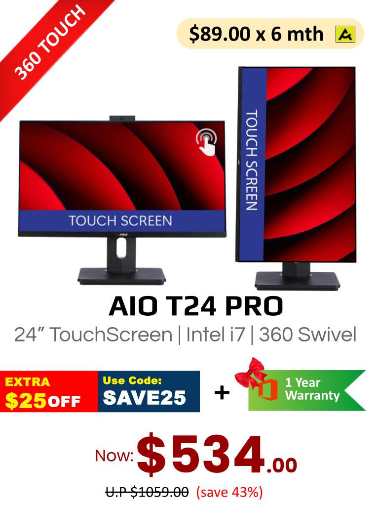 Experience the ultimate blend of style and performance with the X-PRO All-in-One PC (T24 Pro) . Featuring a stunning 24" slim bezel IPS FHD touch screen display, it delivers breath taking visuals and a smooth, interactive user experience.